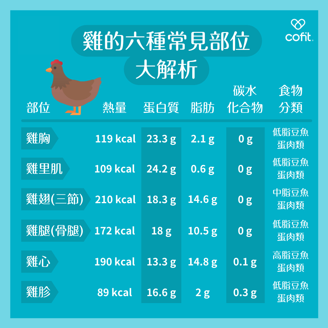 了解了雞肉不同部位之後,下次在挑選時可以有更多選擇啦!吃膩了雞胸?其實雞腿的脂肪也不高,甚至想要吃點內臟類,也可以做更多的變化喔!