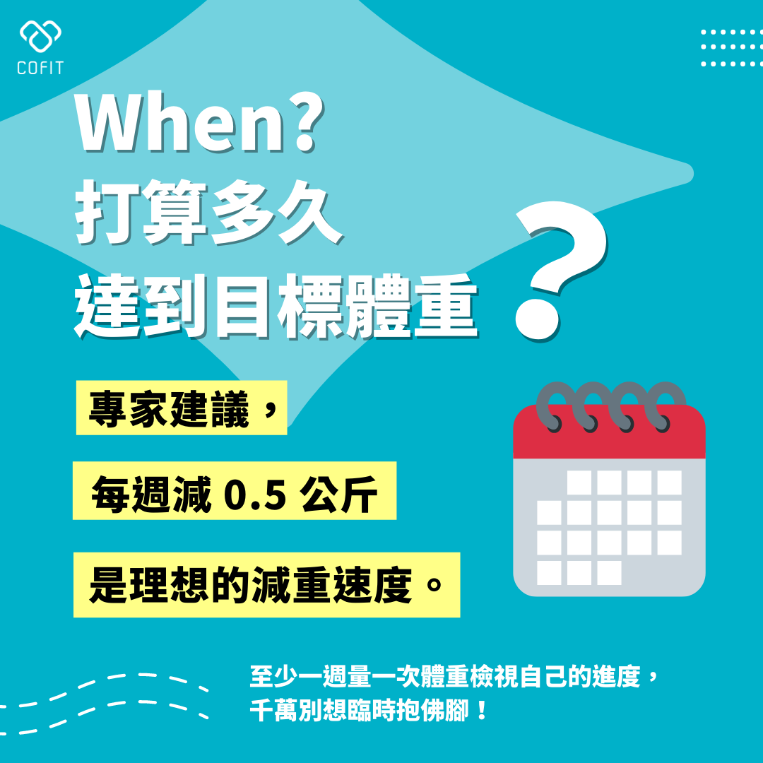 打算花多久時間達到目標體重?專家建議,每週減 0.5 公斤是理想的減重速度。假如計畫 8 週達到減重目標,千萬別想要臨時抱佛腳,因為就算一時過關也往往都會還(胖)回去。至少一週量一次體重檢視自己的進度。