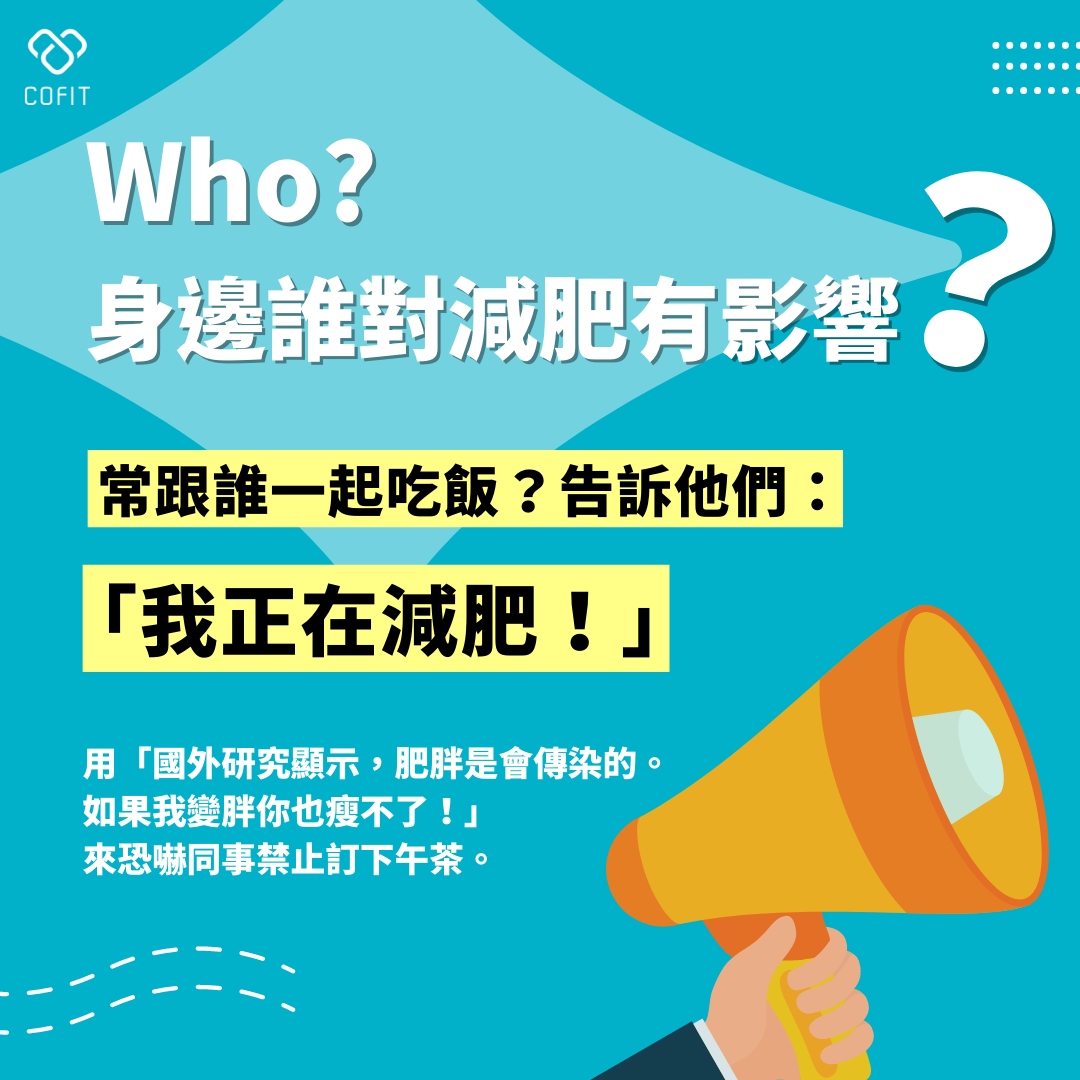 身邊誰對減肥有影響?常常和哪些人吃飯?昭告天下你正在減肥中,再認真告訴他們:「國外研究顯示,肥胖是會傳染的。如果我變胖你也瘦不了!」就一起管住嘴邁開腿啦!