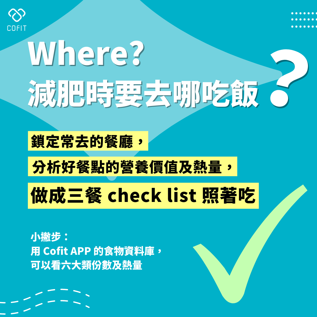 減肥時要去哪裡吃飯?可以鎖定 3~4 家常去的餐廳,並且把菜單拍下來,事先用 Cofit APP 分析好各種餐點的營養價值和熱量。把一日三餐做成 check list,照著吃就打勾 ,這樣做不瘦也難!