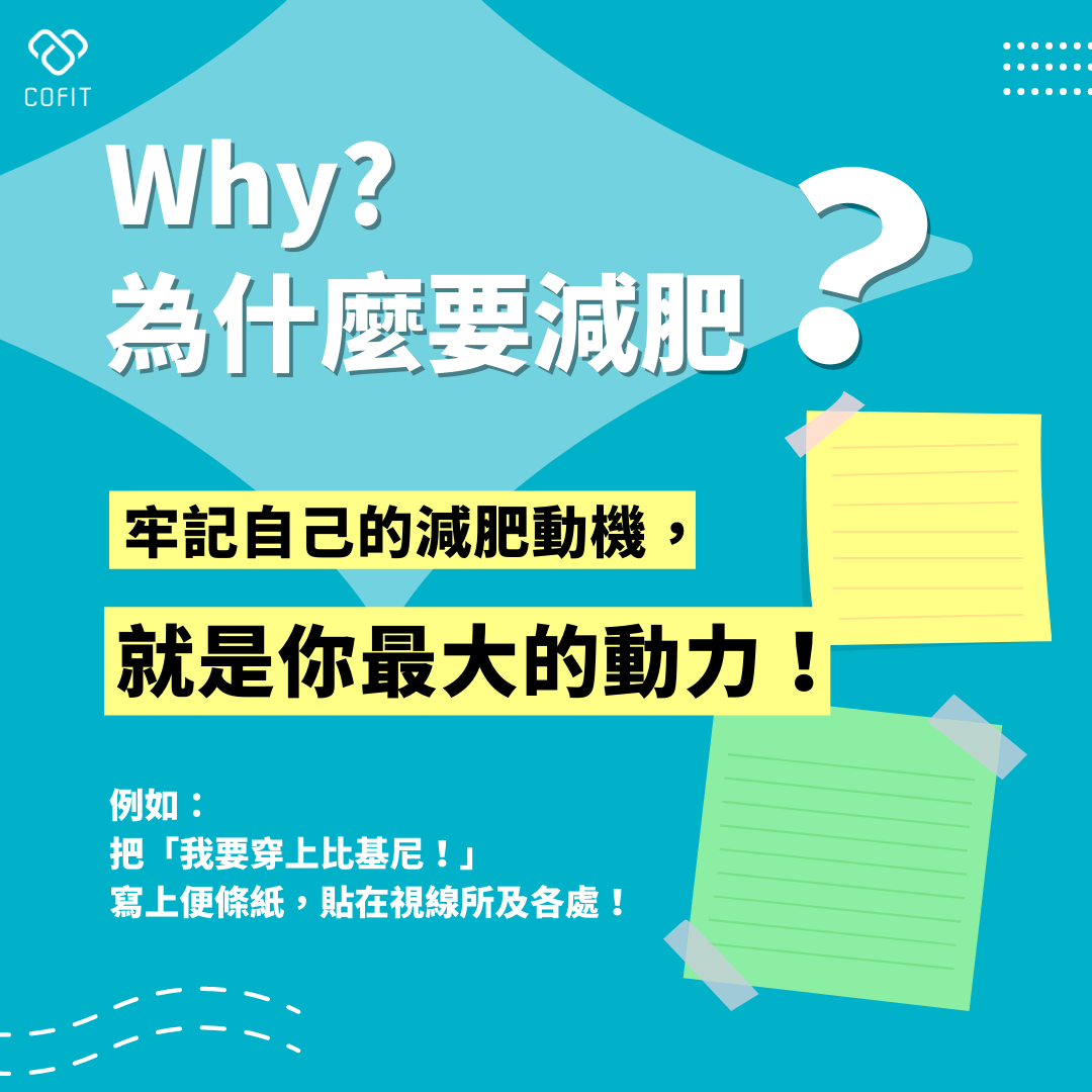 為什麼要減肥?減肥的理由,就是最大的動力!理由越簡單明確越好,最好每天默念100遍,並用便利貼寫下來貼到冰箱前,隨時提醒自己勿忘初衷!
