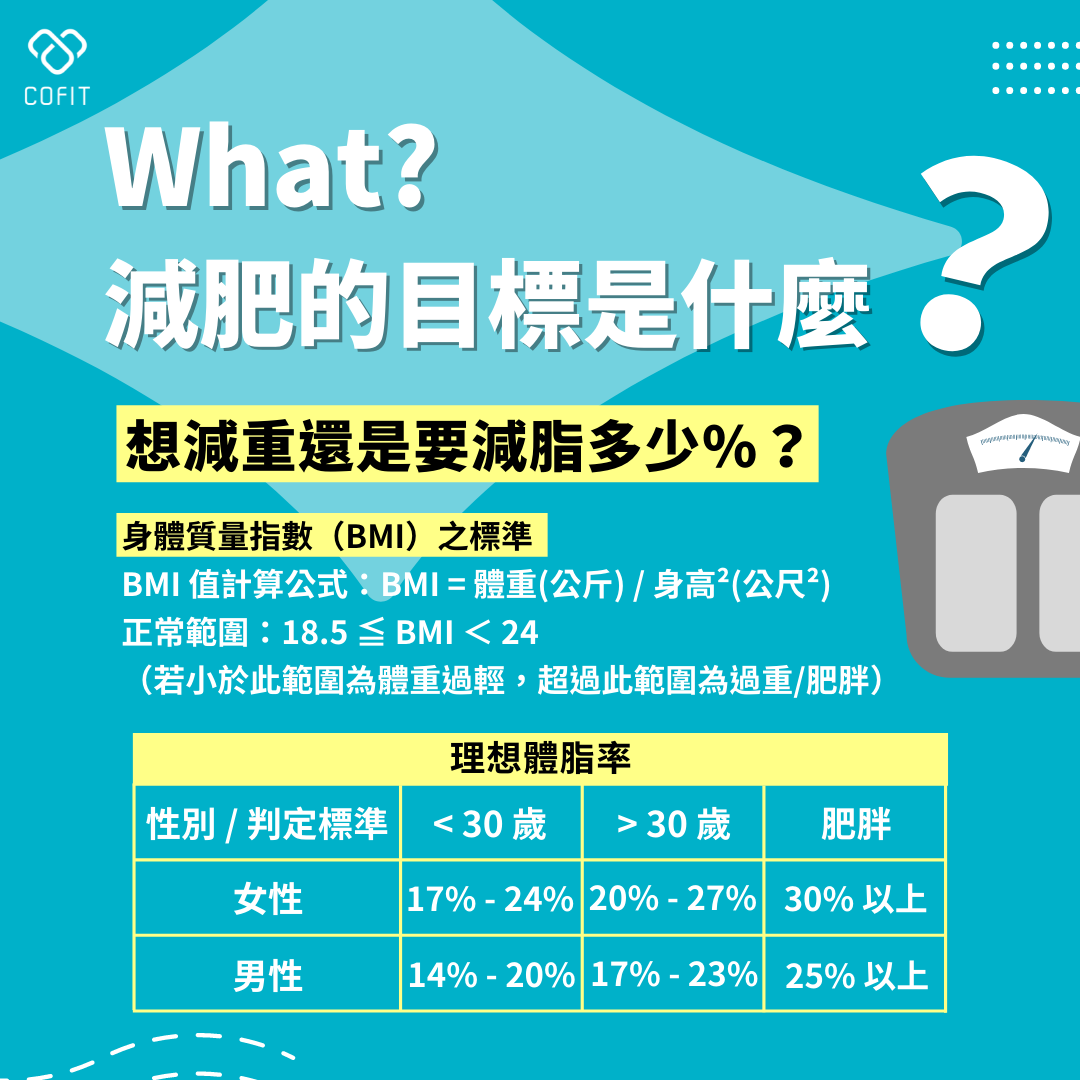 減肥的目標是什麼?要減重還是要減脂多少%?下圖可以知道自己的體重和體脂標準區間。貼心提醒,體型要好看,其實 體脂 比體重更重要喔!