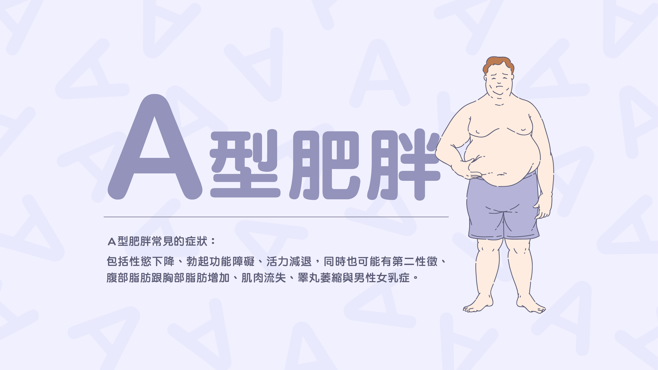 (A型肥胖常見的症狀:包括性慾下降、勃起功能障礙、活力減退,同時也可能有第二性徵、腹部脂肪跟胸部脂肪增加、肌肉流失、睪丸萎縮與男性女乳症。)