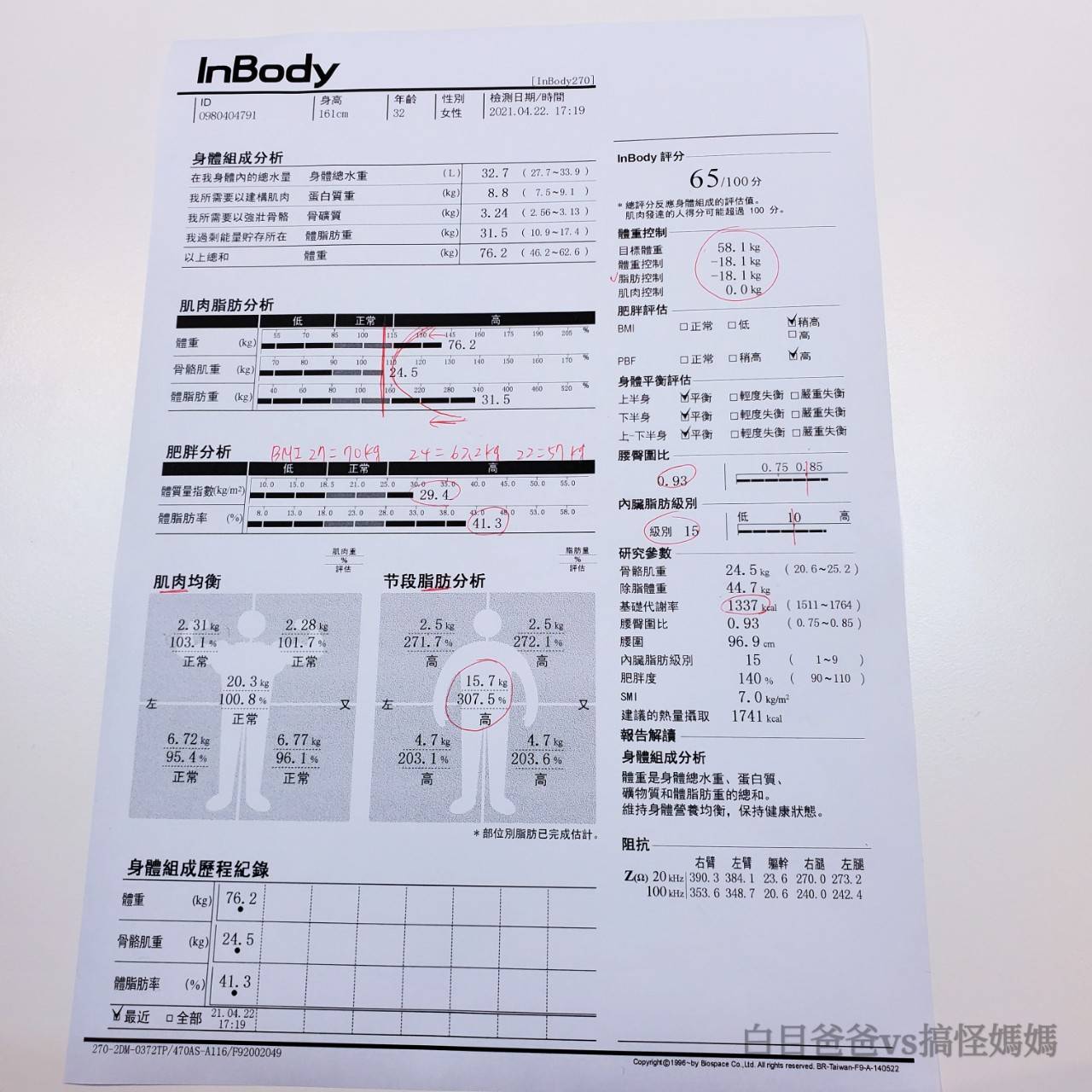 在預約日期去到診所,小幫手先用專業 inbody 體組成計幫妳做測量,量測後會印出一張許多資料的表,有全身的肌肉與脂肪分佈、體脂率、肌肉重、內臟脂肪、BMI...等,測量項目非常詳細!