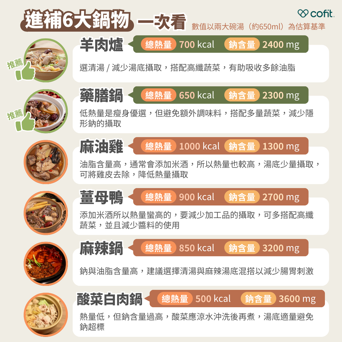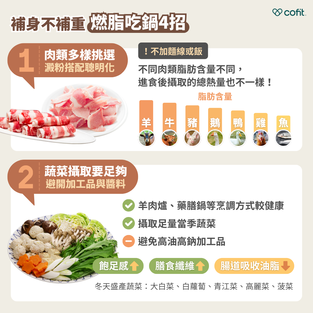 減少湯底攝取可降低鈉含量,羊肉富含鐵質但飽和脂肪酸較高,搭高纖蔬菜,有助吸收多餘油脂