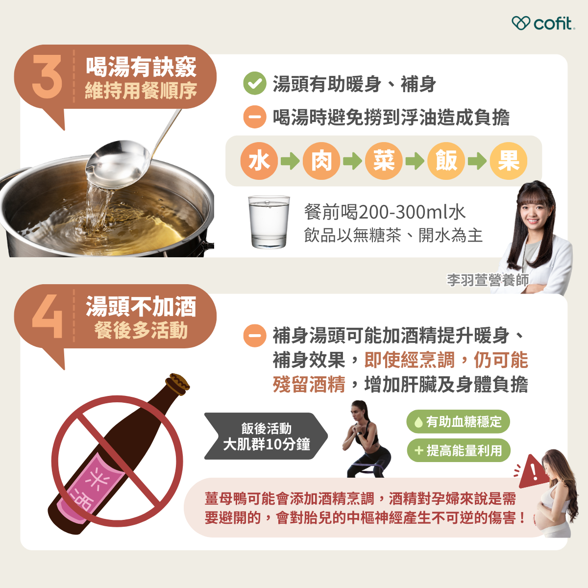 補身湯頭可能加酒精提升暖身、補身效果,即使經烹調,仍可能殘留酒精,增加肝臟及身體負擔!而薑母鴨可能會添加酒精烹調,酒精對孕婦來說是需要避開的,會對胎兒的中樞神經產生不可逆的傷害 !