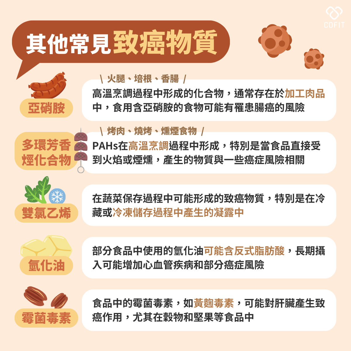 1. 亞硝胺: 亞硝胺是一種在高溫烹調過程中形成的化合物,通常存在於加工肉品(如火腿、培根、香腸等)。亞硝胺的攝入被與腸癌的風險相關聯。
