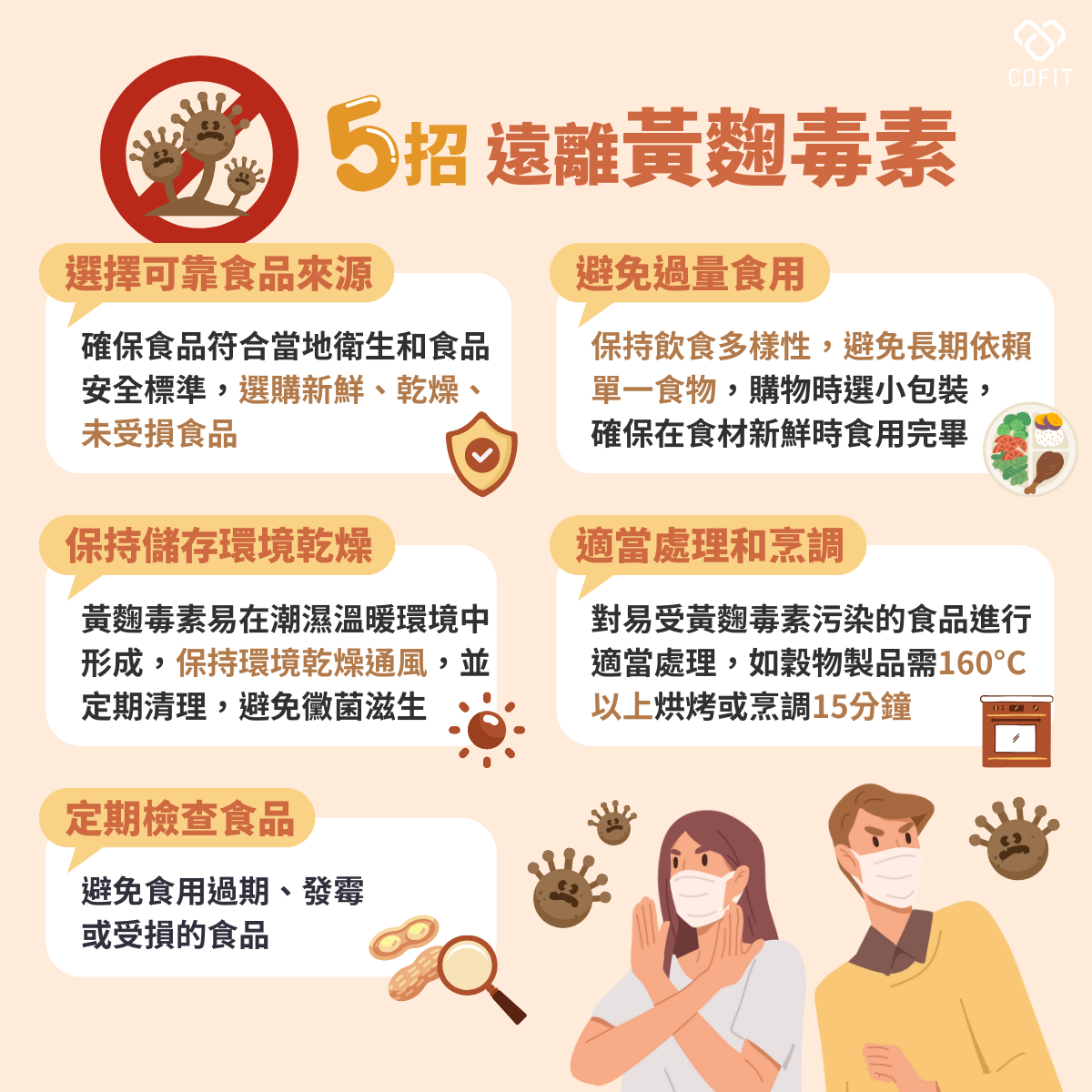 黃麴毒素並不能靠高溫加熱來完全消滅,預防的關鍵在於良好的飲食習慣及衛生,以下有五個小要點: