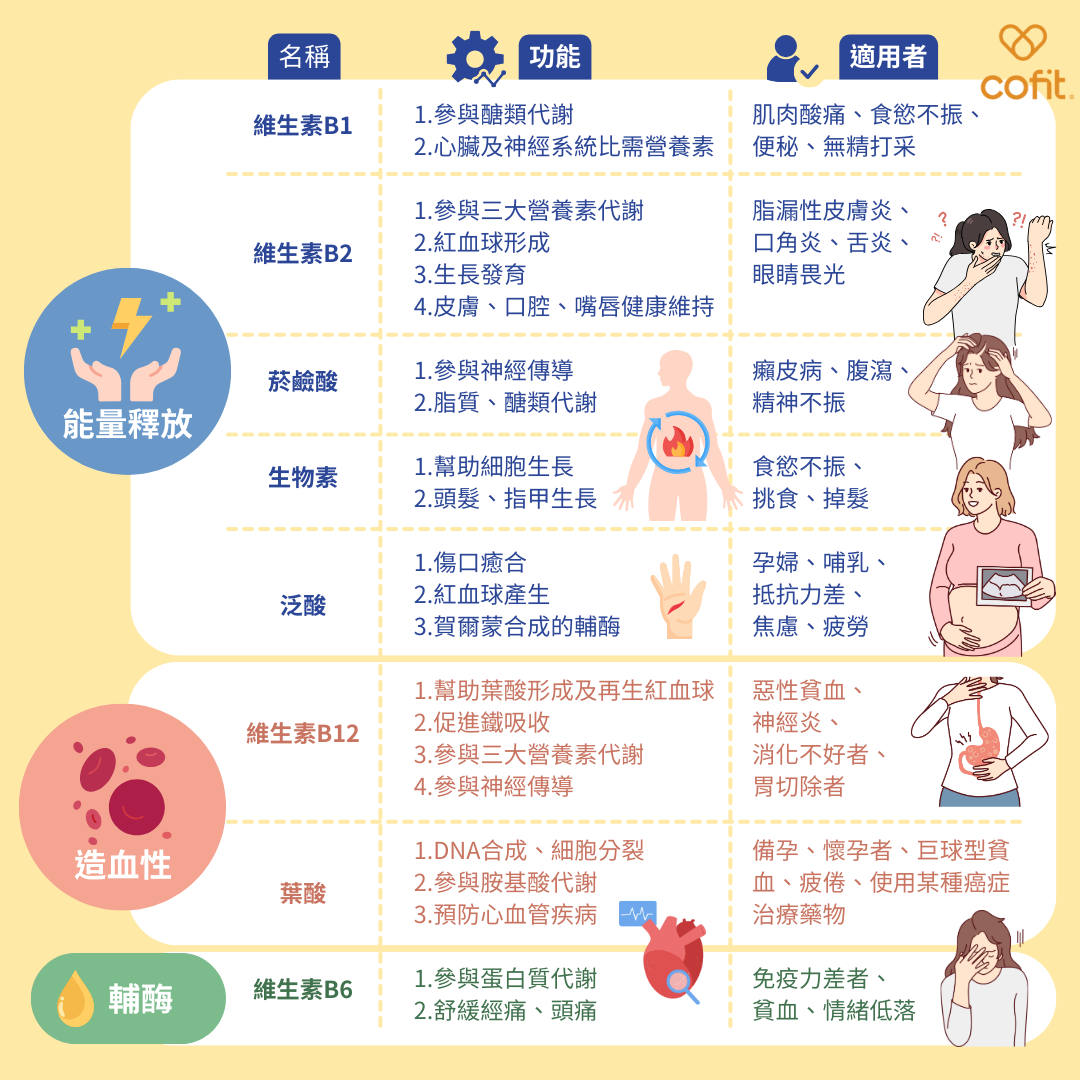 可以依照圖表上對應的症狀來補給,記得一開始的補給建議從早餐上開始補充,確定自己身體對於B群的適應性為何!