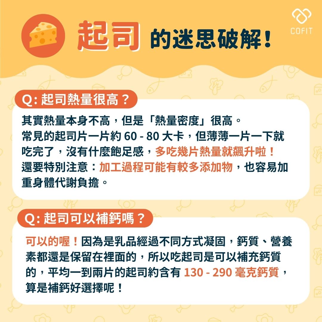 很高,一個不小心就會吃過量。常見的起司片,一片約 60 - 80 大卡,大約與半杯牛奶相同。