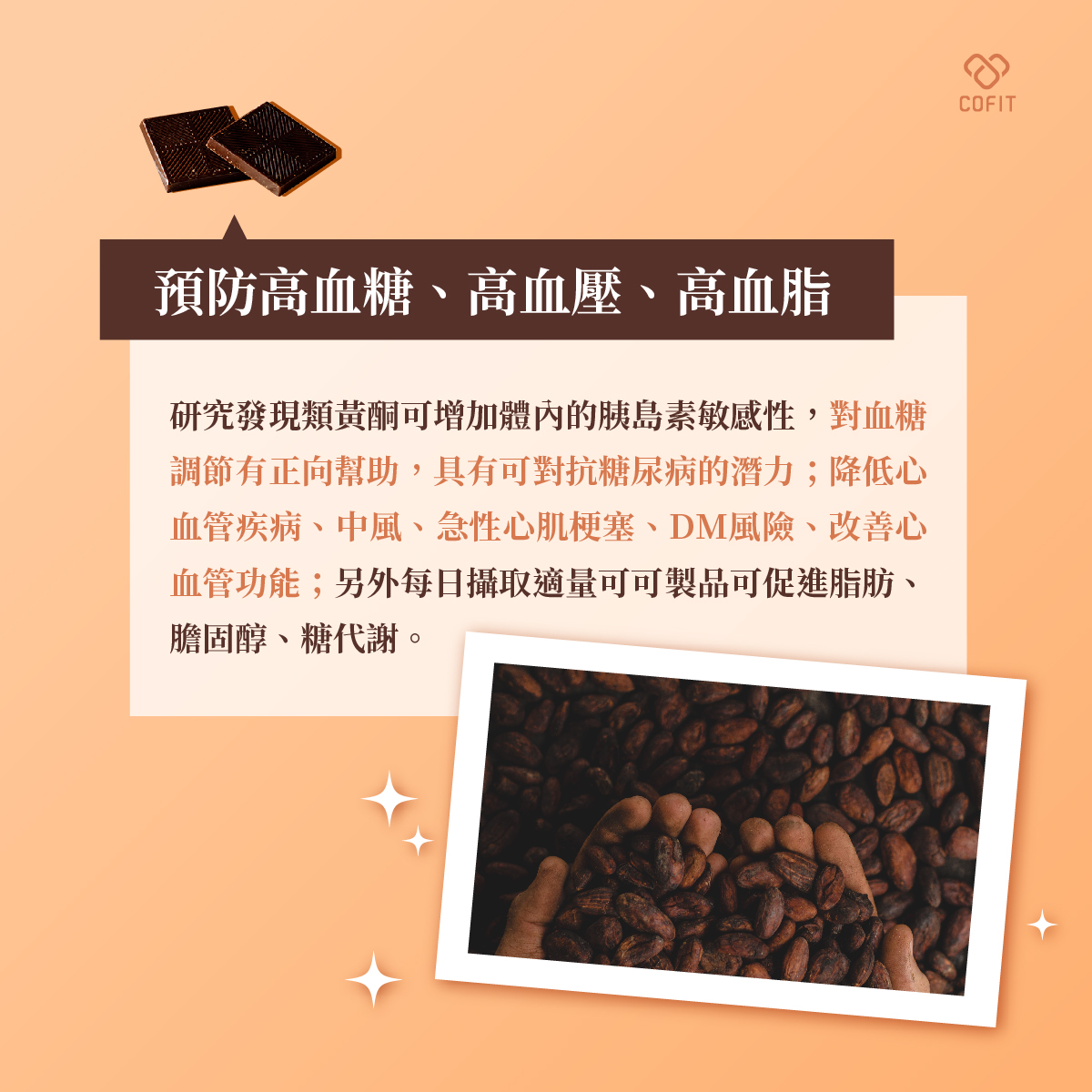 研究發現類黃酮可增加體內的胰島素敏感性,對血糖調節有正向幫助,具有可對抗糖尿病的潛力];降低心血管疾病、中風、急性心肌梗塞、DM風險、改善心血管功能;另外每日攝取適量可可製品可促進脂肪、膽固醇、糖代謝。。