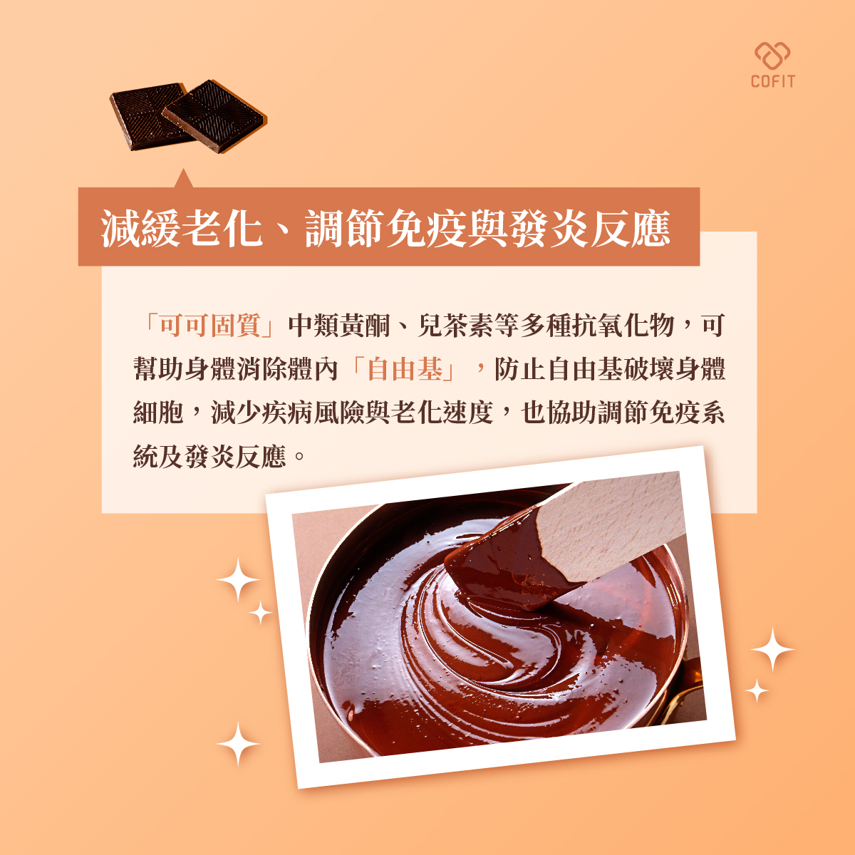 「可可固質」中類黃酮、兒茶素等多種的抗氧化物,除可幫助身體消除體內「自由基」,防止自由基破壞身體細胞,減少疾病風險與老化速度,也協助調節免疫系統及發炎反應。