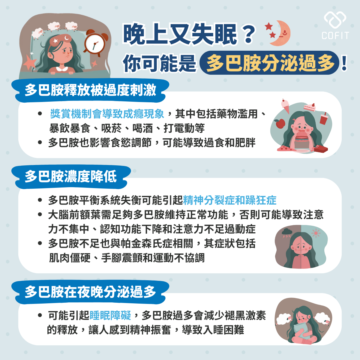 反而會引起睡眠障礙。多巴胺與保持清醒有關,夜晚多巴胺過多會減少褪黑激素的釋放,讓人感到精神振奮,進而導致入睡困難的問題。