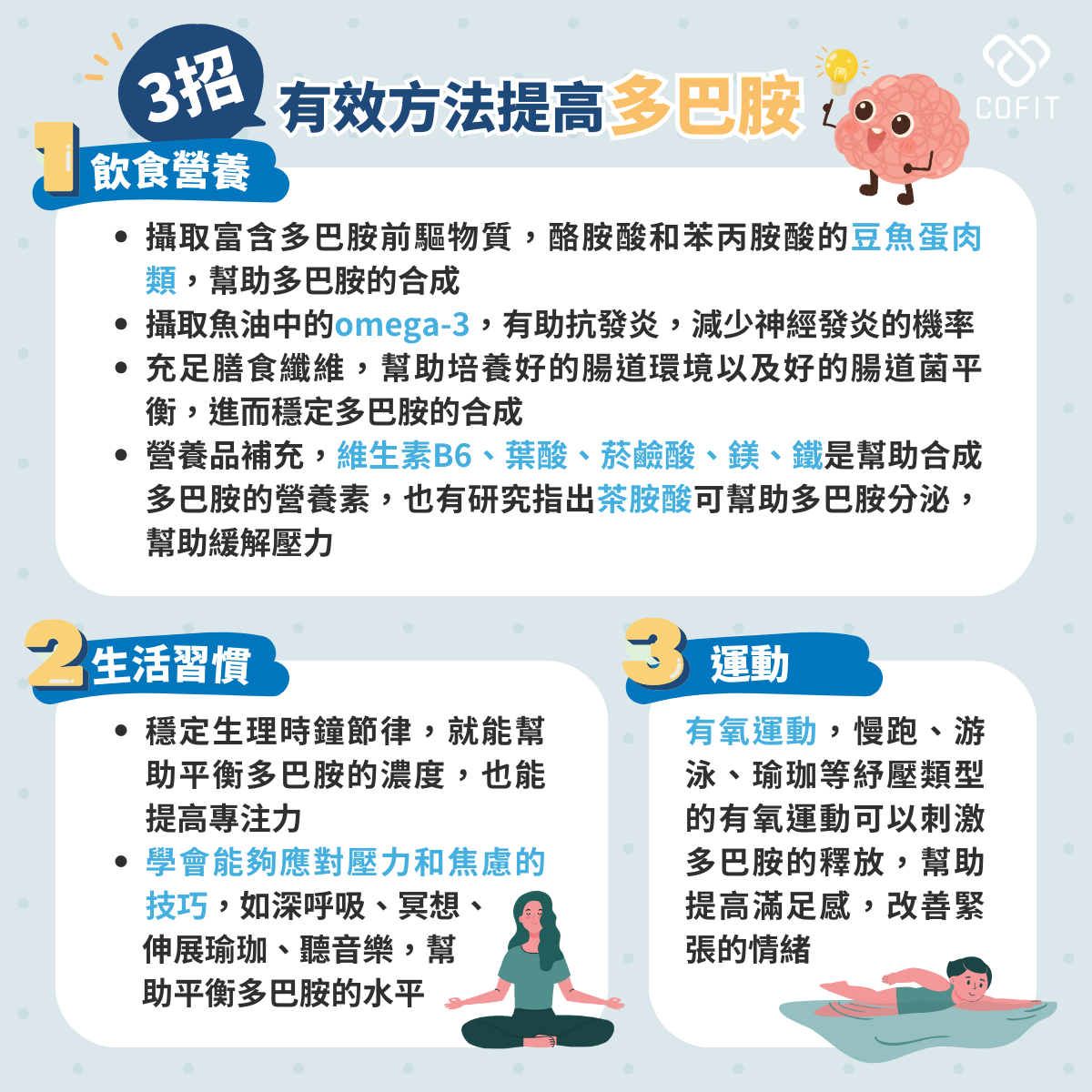 1.攝取富含多巴胺前驅物質,酪胺酸和苯丙胺酸的豆魚蛋肉類,幫助多巴胺的合成。