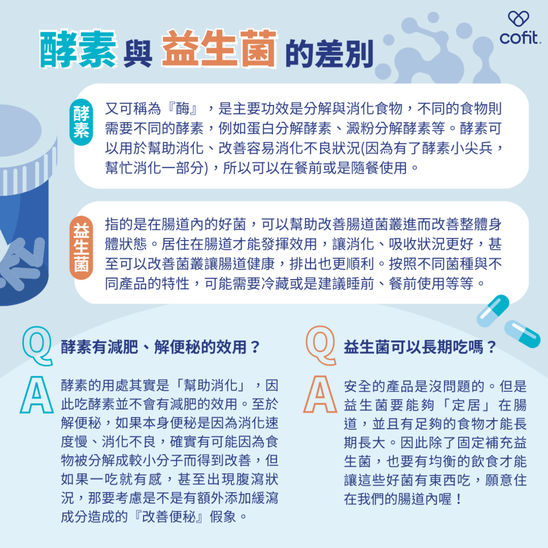 慎選酵素、益生菌,品牌值得信任的大廠,有安全相關認證,甚至標明活性成分、菌種菌株數量、沒有額外添加瀉藥成份等,這些都是挑選的大原則。其他則可看自身的需要,是否有額外增加的保健功效,例如增加代謝、穩定血糖等,找到符合自身需求的保健品並且長期穩定使用,搭配正確的飲食與生活習慣,這才是真正的保養之道!