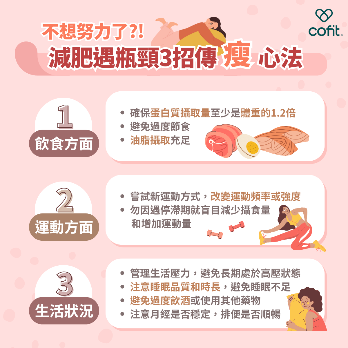 遇到瓶頸是非常正常的!即使一開始減重進展順利,減重、減脂的速率一定也會遇到趨緩的階段。當經歷多次減重經驗、身體荷爾蒙內分泌較不平衡、使用較不適合身體狀況的減重方式時,瓶頸的發生機會就會增加,並且更難突破。