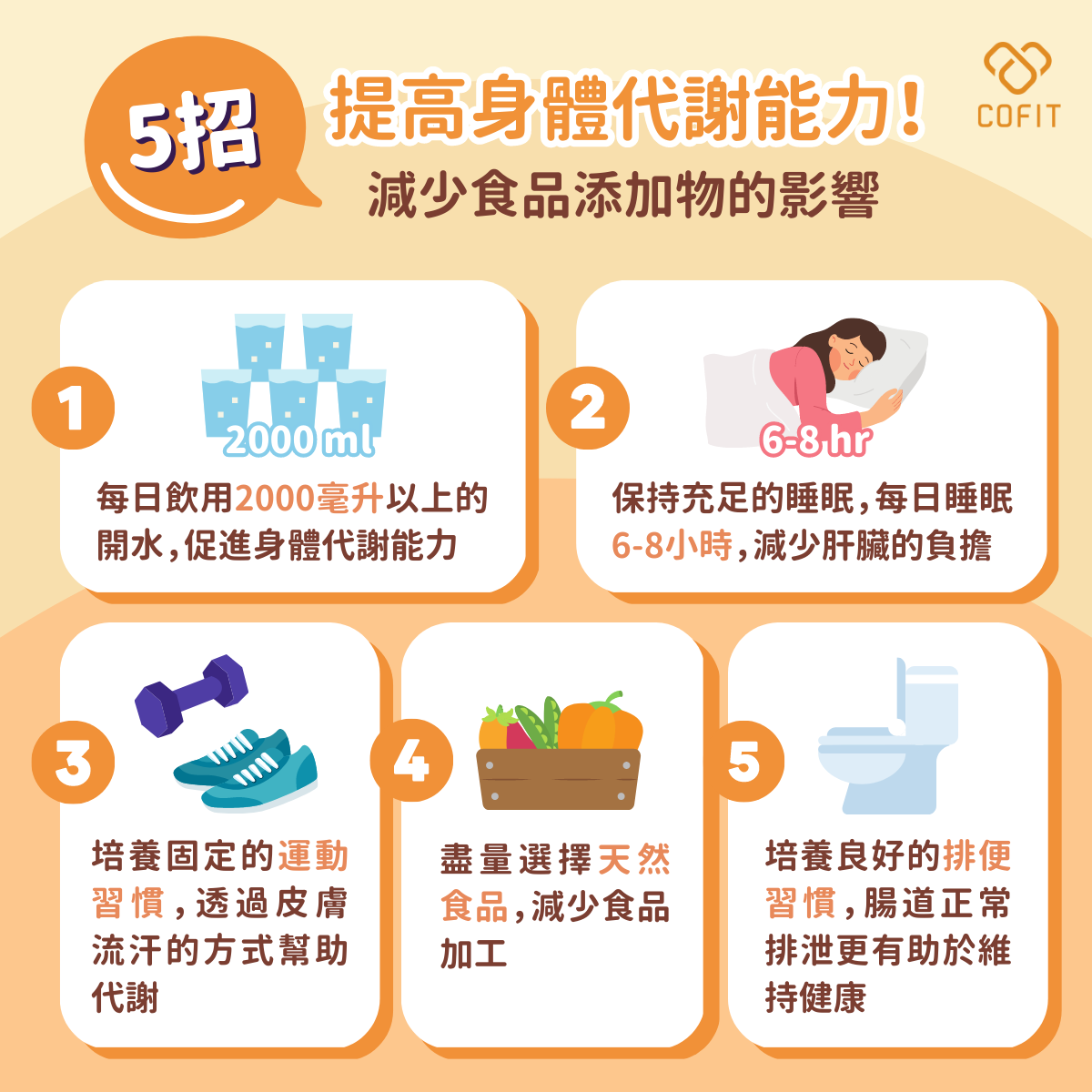 為了降低食品添加物對身體的影響,可以增強身體的代謝能力。你可以遵循以下五點: