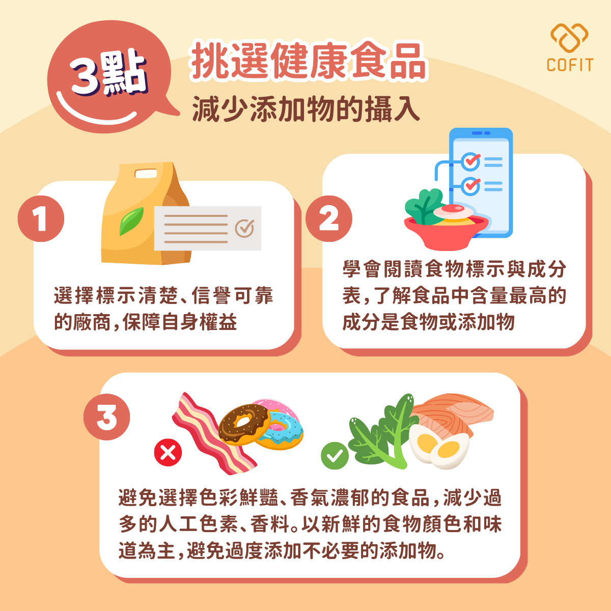 至於挑選食品時,有沒有什麼可以注意的地方以減少額外的添加物呢?請注意以下三點: