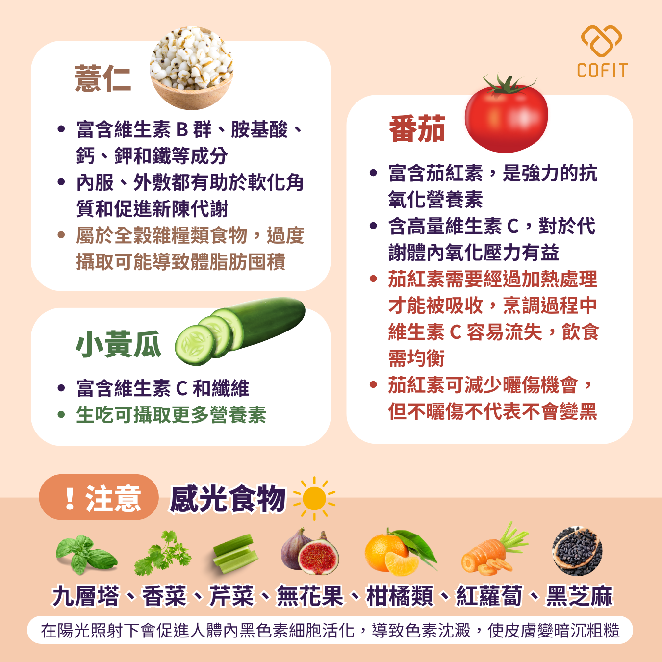 維生素C可以抑制酪氨酸的活化,進一步減少黑色素和斑點的形成,因此常聽到建議攝取富含維生素C的食物來達到美白效果;然而,食物中的維生素C對美白的作用實際上並不大。但是,吃對一定是可以變美的,營養均衡可以維持膠原蛋白的完整性,保持皮膚的水潤,減少發炎、防止痘痘和粉刺等問題的出現!