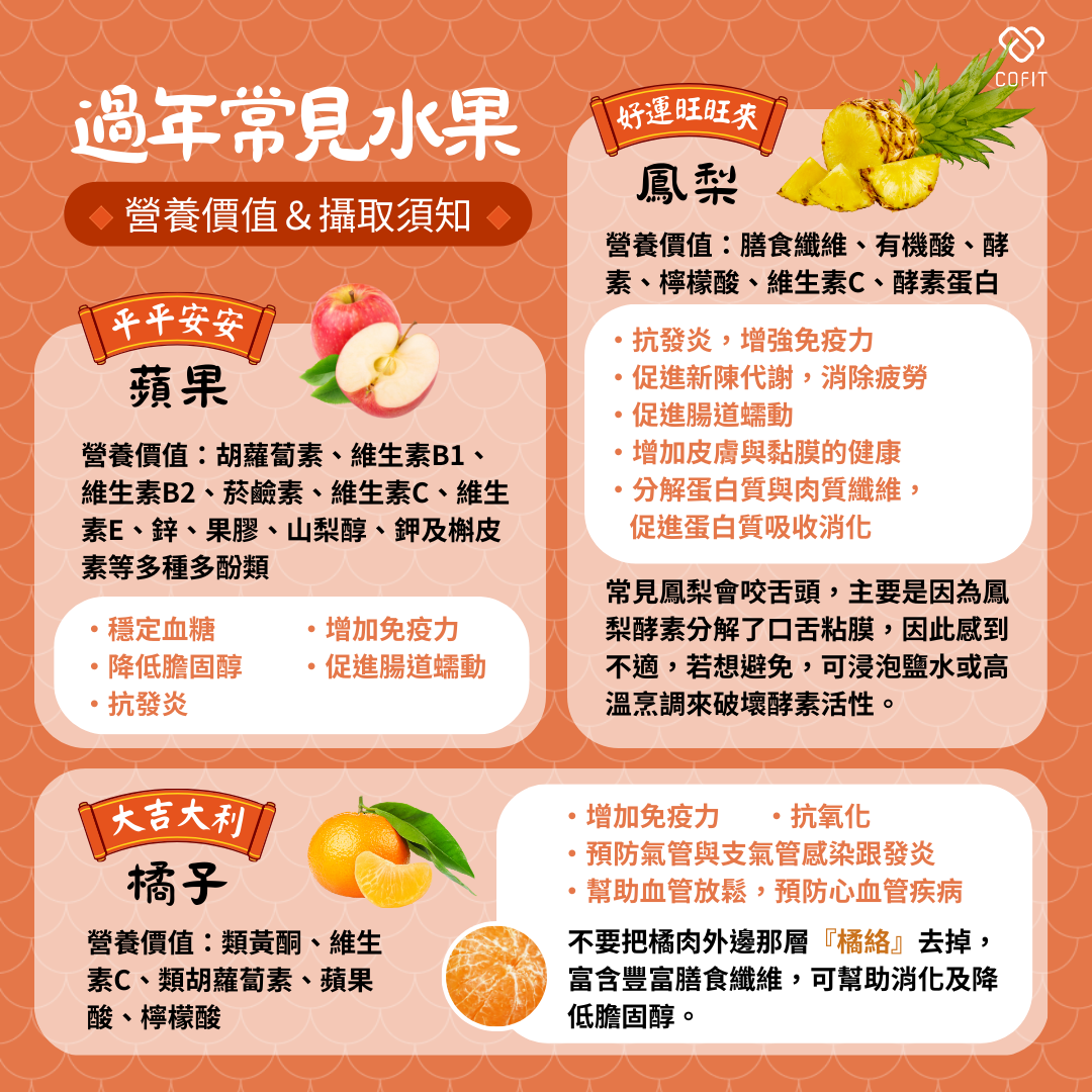 臺灣這個水果王國,不管什麼節日都會有水果的出現,接下來過年期間除了大魚大肉之外,還常常會出現一盤盤甜蜜蜜的水果。今天營養師來談談過年常見水果的營養價值,並且提醒大家該怎麼攝取,才不會讓自己的血糖無時無刻都在坐雲霄飛車般飆高又驟降。
