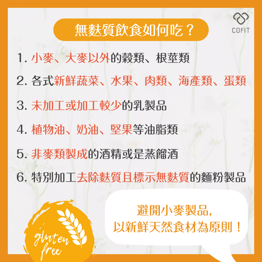 1.小麥、大麥以外的穀類、根莖類:稻米、玉米、小米、馬鈴薯、地瓜、藜麥、蕎麥、薏仁等,或是標示有不含麩質的燕麥。