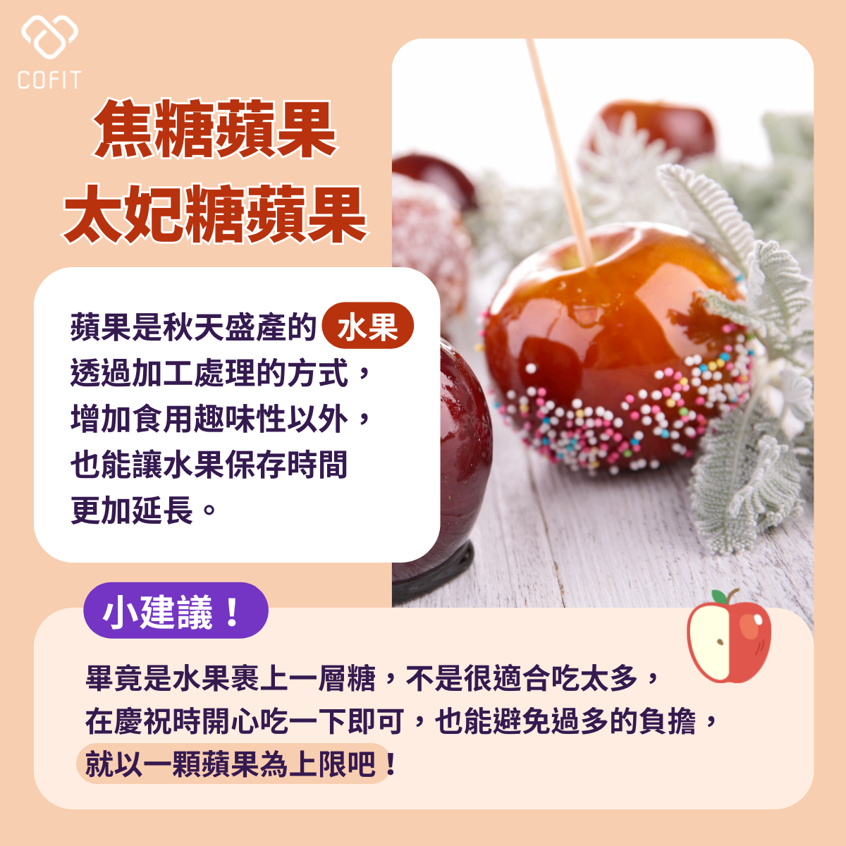 其實這是英國的傳統甜點,新鮮蘋果裹上一層太妃糖或是焦糖漿,整顆啃著吃,就像是大型的糖葫蘆!再黏上巧克力米或是其他裝飾,就成了美麗又美味的甜點。蘋果也是秋天盛產的水果,透過加工處理的方式,增加食用趣味性以外,也能讓水果保存時間更加延長。但畢竟是水果裹上一層糖,不是很適合吃太多,在慶祝時開心吃一下即可,也能避免過多的負擔,