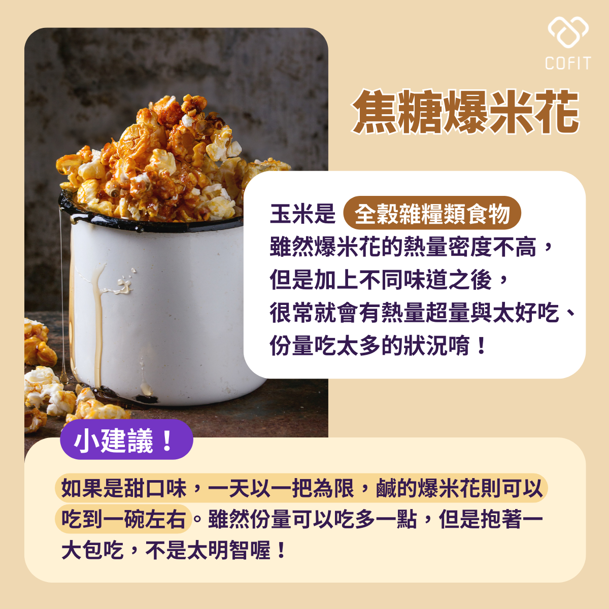 玉米是秋天盛產食材,做成爆米花,淋上各種口味,不管是鹽味、焦糖、或是其他口味,都很適合大家共享。雖然爆米花的熱量密度不高,但是加上不同味道之後,很常就會有熱量超量與太好吃、份量吃太多的狀況唷!如果是