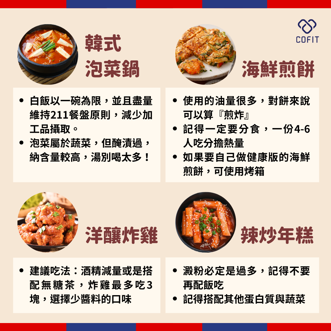 通常會搭配米飯,這是白飯小偷,記得白飯以一碗為限,並且盡量維持211餐盤原則,減少加工品攝取;泡菜也屬於蔬菜,但
