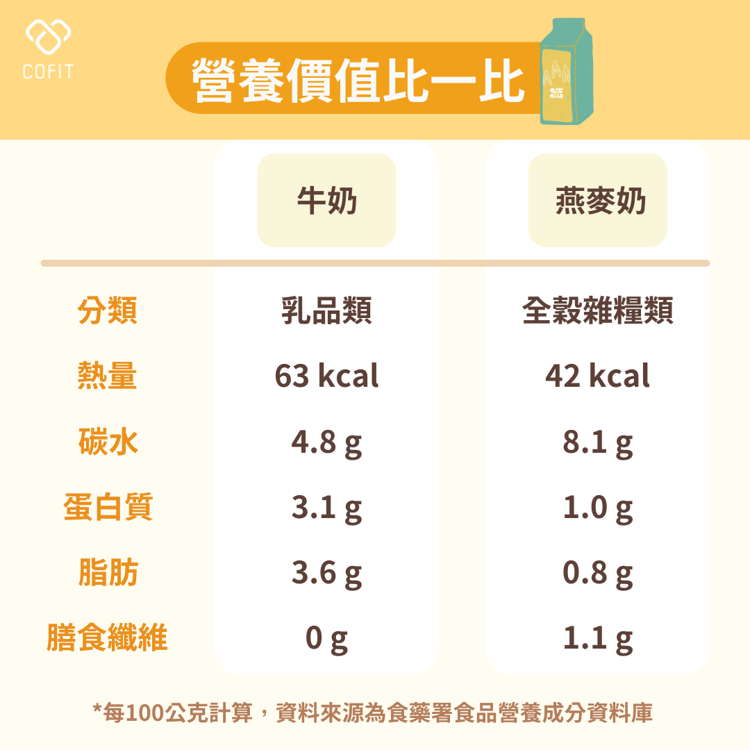 燕麥奶與牛奶是屬於兩種不同的食物分類,不可以互相取代。牛奶是乳品類,含有豐富的鈣質與優質蛋白質,但因為含有乳蛋白與乳糖的關係,不適合給牛奶過敏或者乳糖不耐受的人。而燕麥奶屬於全穀雜糧類,不含乳糖,所以對於乳糖不耐的患者可以食用,而且燕麥奶具有脂肪含量低與含有水溶性纖維等優點,但是嚴重缺乏蛋白質,主要營養素皆是碳水化合物,喝下去容易造成血糖大幅度波動,需要控制血糖者則要特別注意!