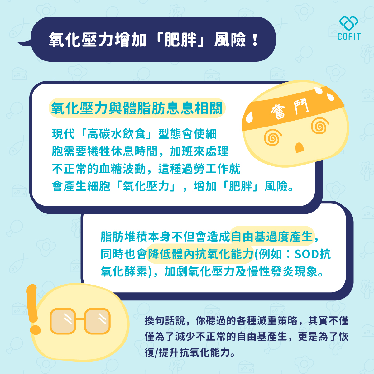 根據研究指出,氧化壓力與體脂肪息息相關。現代「高碳水飲食」型態會使細胞需要犧牲休息時間,加班來處理不正常的血糖波動,這種過勞工作就會產生細胞「氧化壓力」,增加「肥胖」風險。而脂肪堆積本身不但會造成自由基過度產生,同時也會降低體內抗氧化能力(例如:SOD抗氧化酵素),加劇氧化壓力及慢性發炎現象。換句話說,你聽過的各種減重策略,其實不僅僅為了減少不正常的自由基產生,更是為了恢復/提升抗氧化能力。