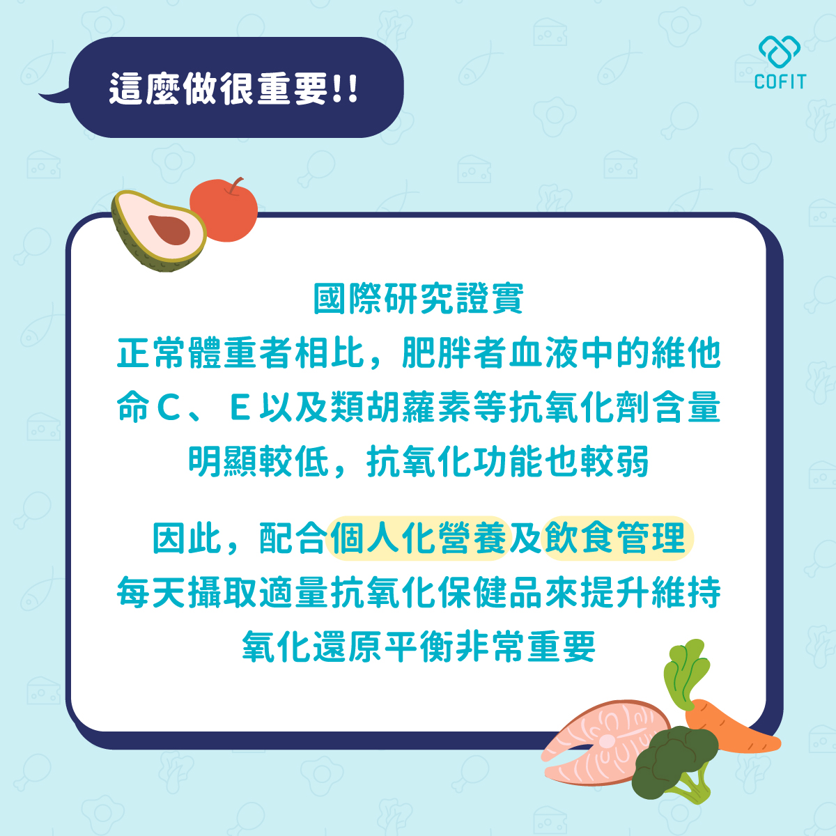 國際研究證實,正常體重者相比,肥胖者血液中的維他命C、E以及類胡蘿素等抗氧化劑含量明顯較低,抗氧化功能也較弱。因此,配合個人化營養及飲食管理,每天攝取適量抗氧化保健品來提升維持氧化還原平衡非常重要。