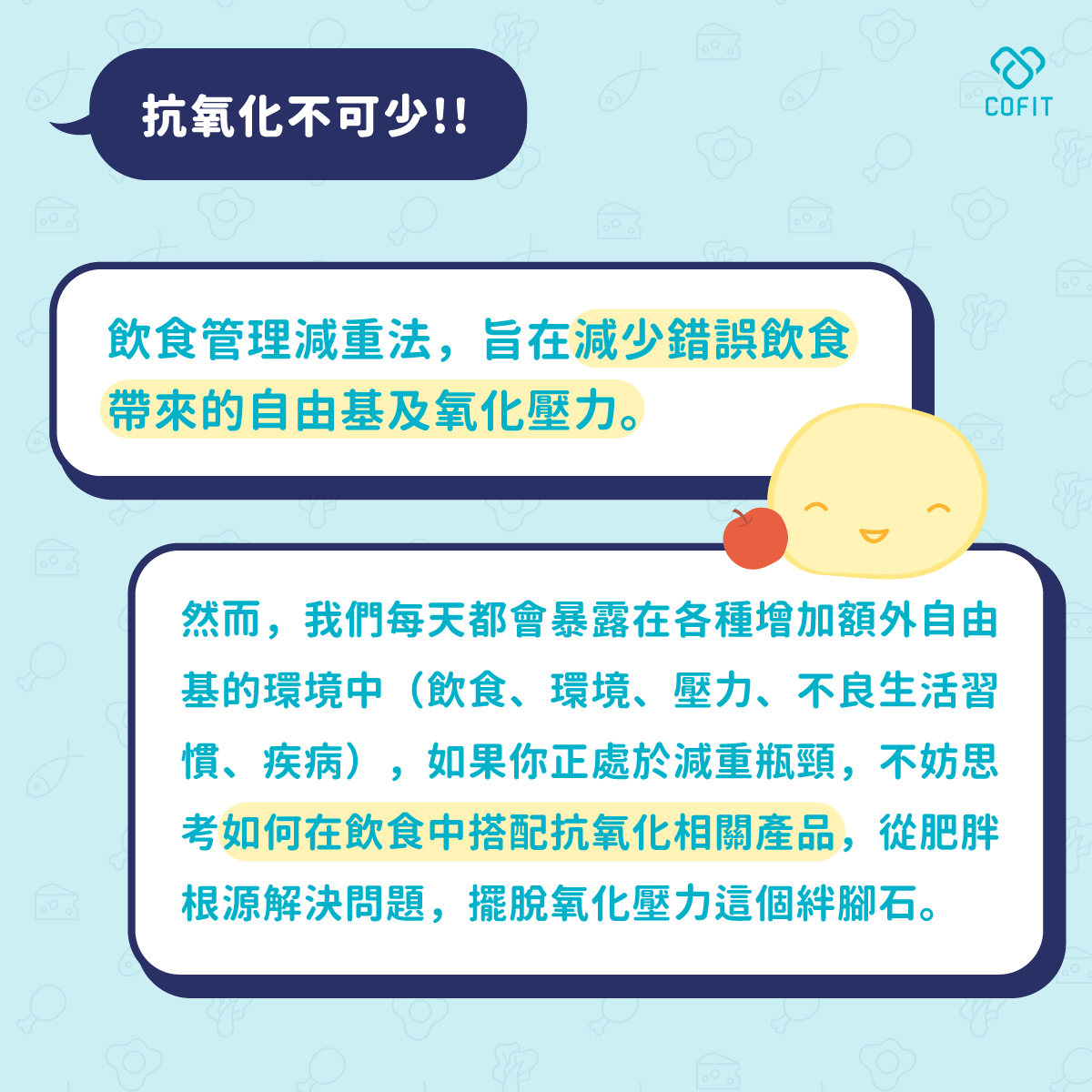 飲食管理減重法,旨在減少錯誤飲食帶來的自由基及氧化壓力。然而,我們每天都會暴露在各種增加額外自由基的環境中(飲食、環境、壓力、不良生活習慣、疾病),如果你正處於減重瓶頸,不妨思考如何在飲食中搭配抗氧化相關產品,從肥胖根源解決問題,擺脫氧化壓力這個拖油瓶。