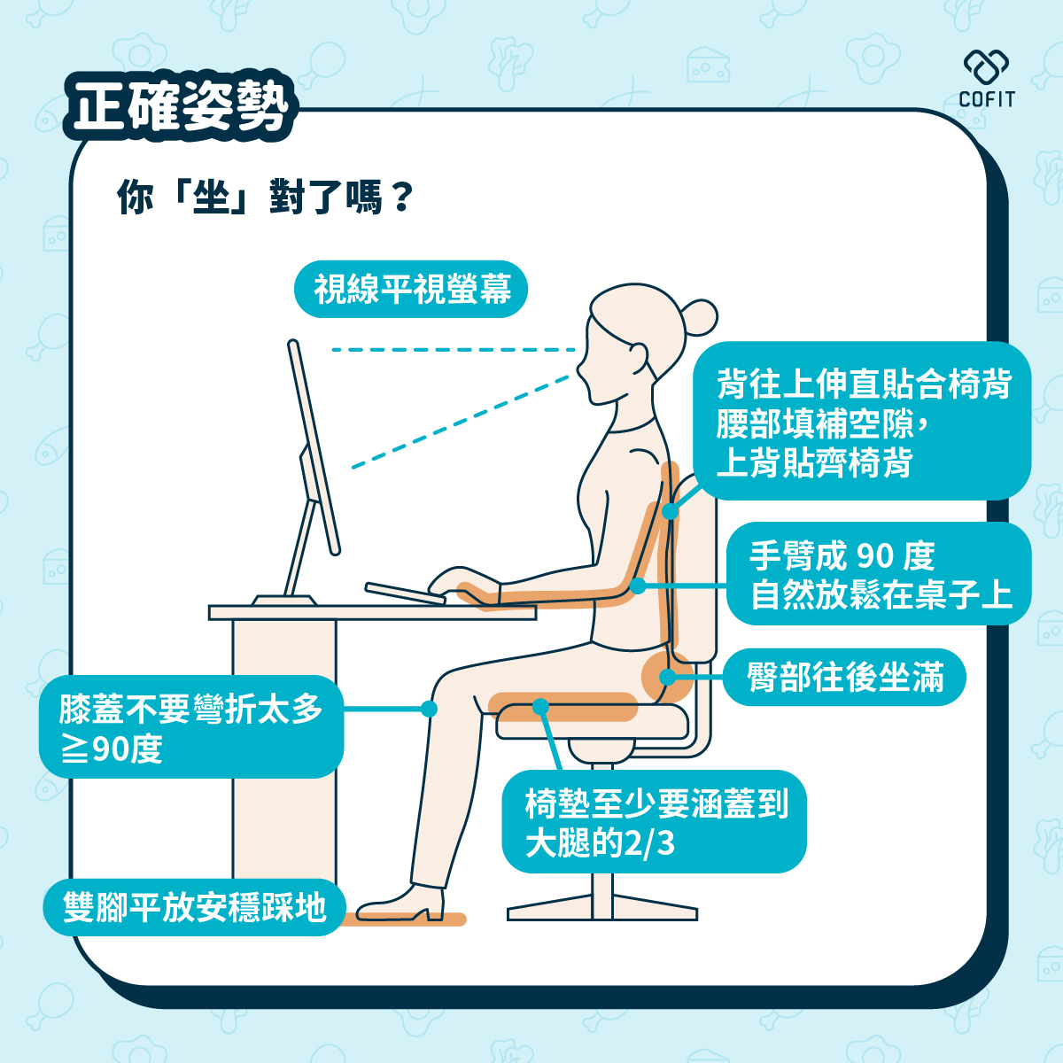 若是坐著時腰部或背部容易懸空,這時建議加上靠墊讓腰和背有一個支撐感,背自然就能保持平直貼在椅背上了!最後手臂也盡量呈90度自然輕鬆放在桌子上,可避免單手撐頭造成的肌肉不平均。