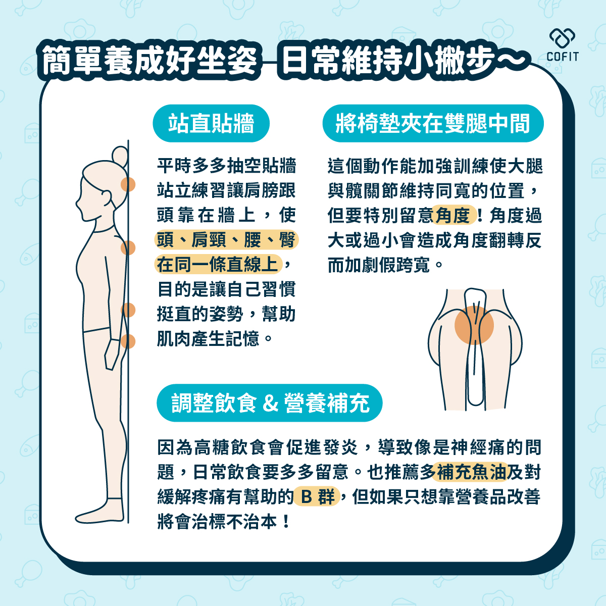 一時之間要調整坐姿並不是一件簡單的事,推薦可以慢慢改善讓身體適應正確的姿勢,使肌肉產生記憶。這樣一來在日後無論是坐著或是站著,挺胸的時候身體自然會挺成直線。