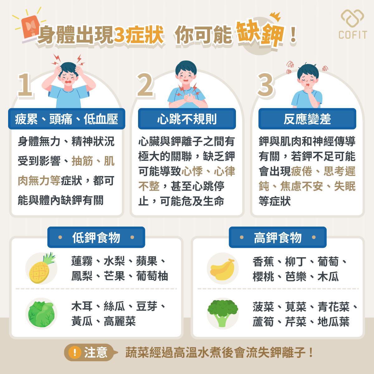 因為鉀與肌肉、神經傳導有關聯,所以若鉀不足也可能會出現疲倦、思考遲鈍、煩躁、失眠等狀況。