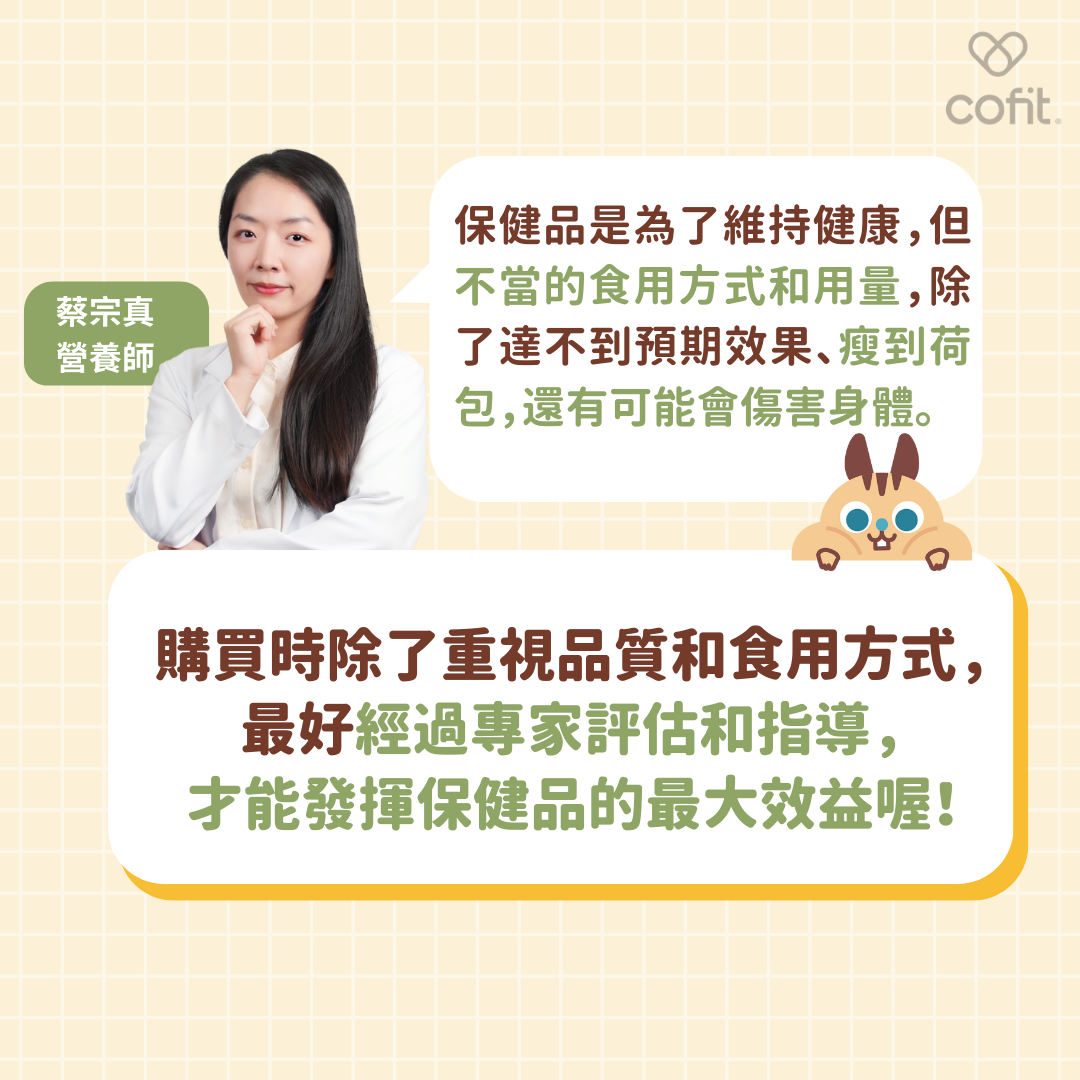 現代人習慣透過保健品維持健康,但不當的食用方式和用量,不只達不到預期的效果,還瘦了荷包,更甚者可能會傷害身體。記住,購買時除了重視品質和食用方式,最好經過專家評估和指導,才能發揮保健品的最大效益喔!