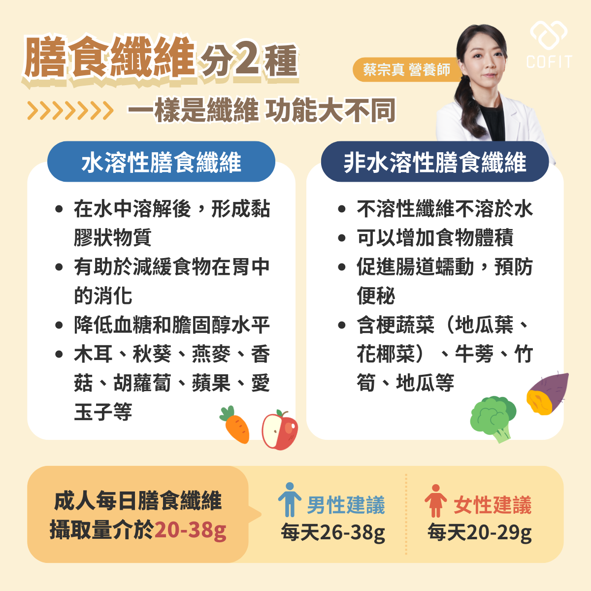 1. 水溶性:在水中溶解後,形成黏膠狀物質,有助於減緩食物在胃中的消化,降低血糖和膽固醇水平;常見的食物有:木耳、秋葵、燕麥、香菇、胡蘿蔔、蘋果、愛玉子等。