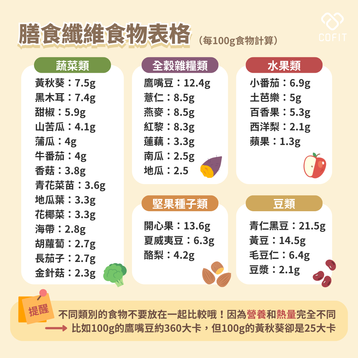 根據國人膳食營養素參考量第八版之建議,成人每日膳食纖維攝取量介於20至38公克,女性建議每天20至29公克男性則建議每天26-38公克,以下整理部分食材以及膳食纖維的含量提供參考: