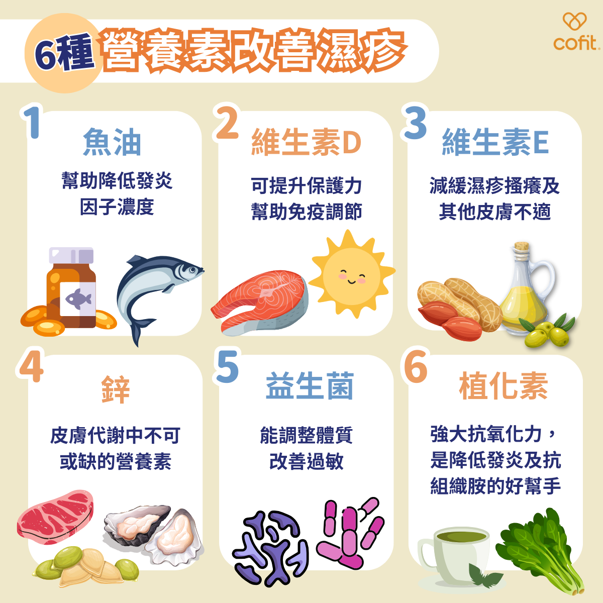 除了改善生活習慣,透過補充以下幾種營養素也有助於調節生理機能、穩定皮膚狀態,可大大降低濕疹復發的機率:
