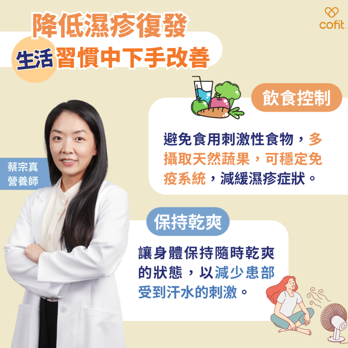 避免食用刺激性食物,如咖啡因、高油重鹹、辛辣食物、酒精等,多攝取天然蔬果,穩定免疫系統,以減緩濕疹症狀。