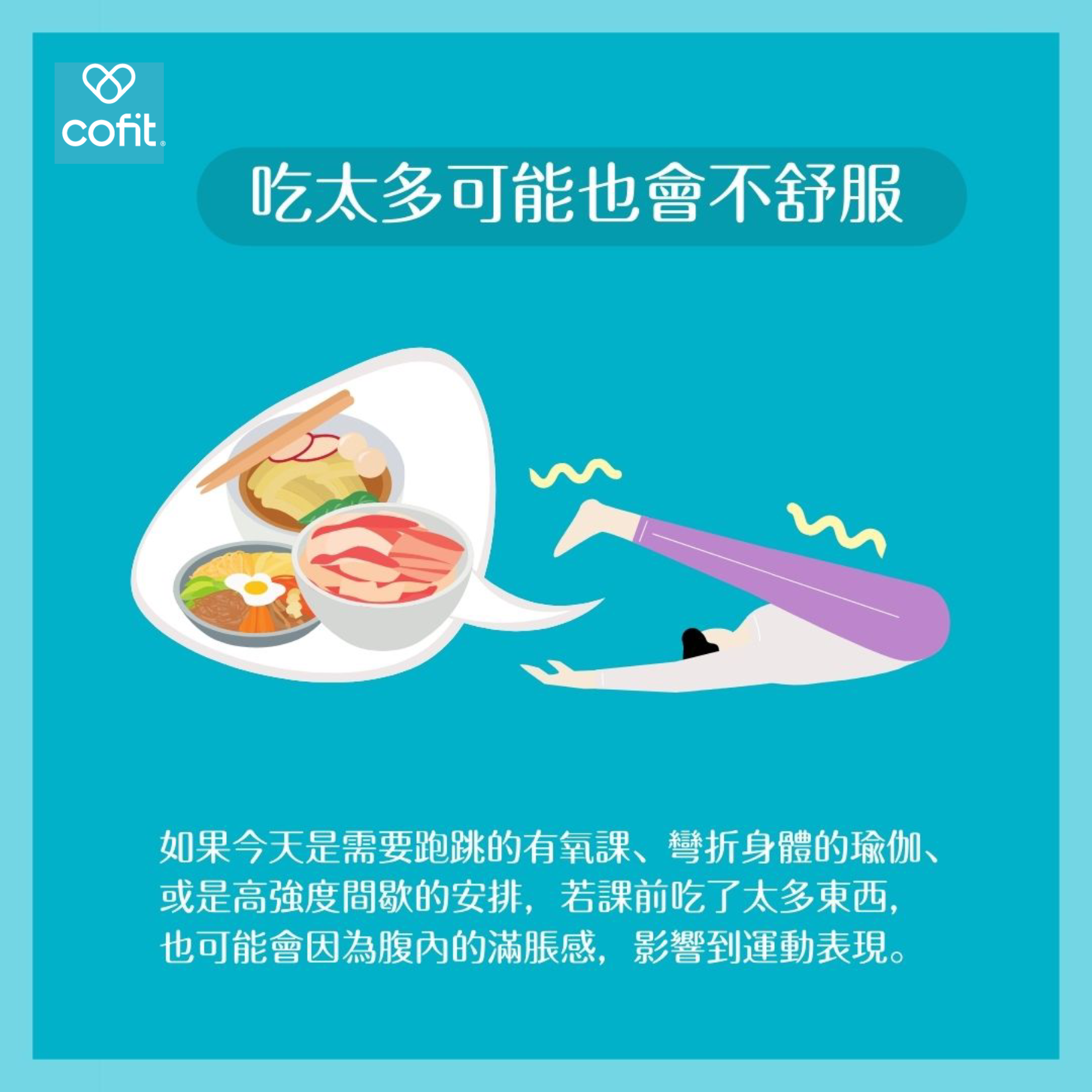 如果今天是需要跑跳、彎折身體,或是高強度間歇的運動安排,課前吃了太多東西,也可能會因為腹內的滿脹感,影響到運動表現喔!