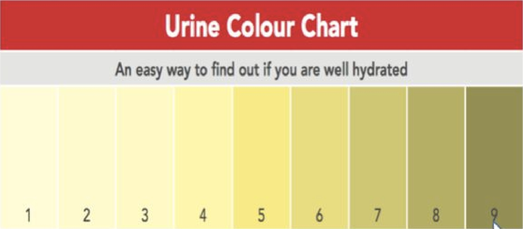 下圖是尿液色卡,可以由排尿狀況來評估自己的體水份是否足夠!通常顏色超過 4,就表示身體缺水囉!運動完記得觀察一下自己的尿液狀態,如果顏色過深,表示這次運動過程補充的水份是不足的。若搭配平常飲食蛋白質含量較高,對於身體負擔也會比較大,記得也要加強整體喝水的狀況喔!