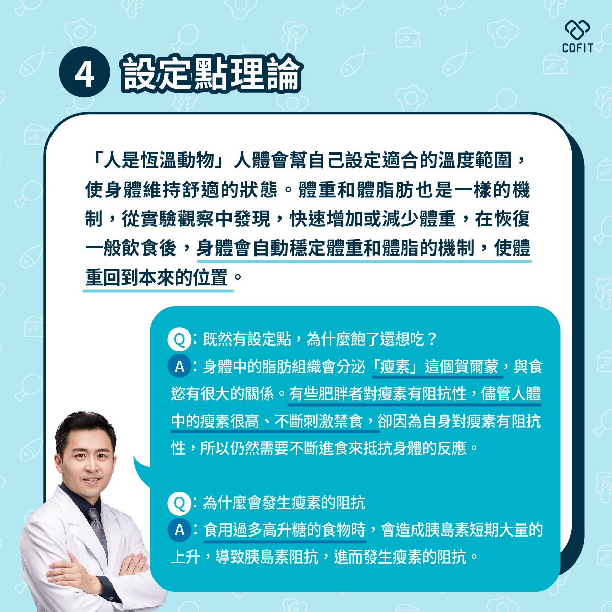 而體重和體脂肪也是一樣的,身體有自動穩定體重和體脂的機制,從實驗觀察中發現,當動物體重快速降低時,只要恢復一般飲食又會回到原來設定點的體重,反之亦然。所以如果設定點是高的,那用盡各種方式減重,只要恢復飲食,身體機制會自動調整回到原本設定的位置。