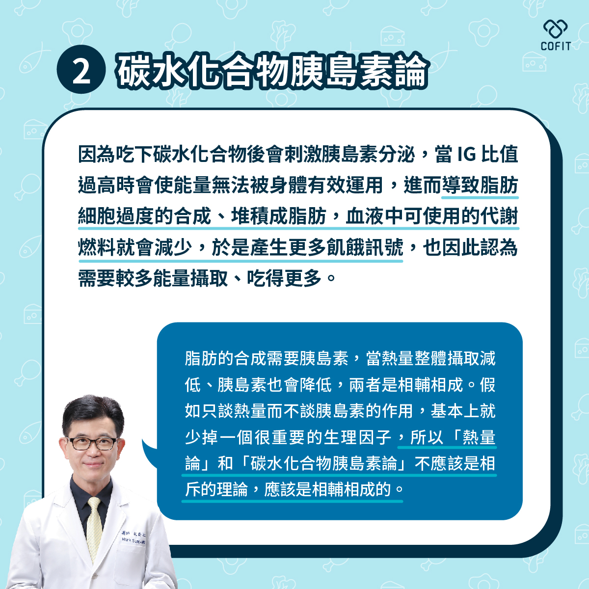 對於這個理論宋晏仁醫師認為:「脂肪的合成一定需要胰島素,那些胰島素不存在的人,例如第一型糖尿病人,體重就會大量流失。所以假如我們只談熱量而不談胰島素的作用,就會少掉一個很重要的生理因子,而熱量整體攝取減低的時候,胰島素也會跟著降低,所以這兩者不應該是相斥的理論,應該會是相輔相成。」