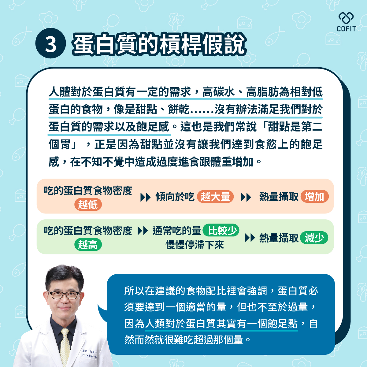人類對於蛋白質有一定的需求,但像蛋糕、甜點、餅乾、洋芋片等高碳水高脂肪食物,因為蛋白質相對較低,所以沒有辦法滿足人體對於蛋白質需求及達到飽足感。就像人們常說的:「甜點是第二個胃。」,其實就是因為高碳水、高脂肪的食物並沒有讓我們得到飽足感,因此會造成過度進食跟體重增加。