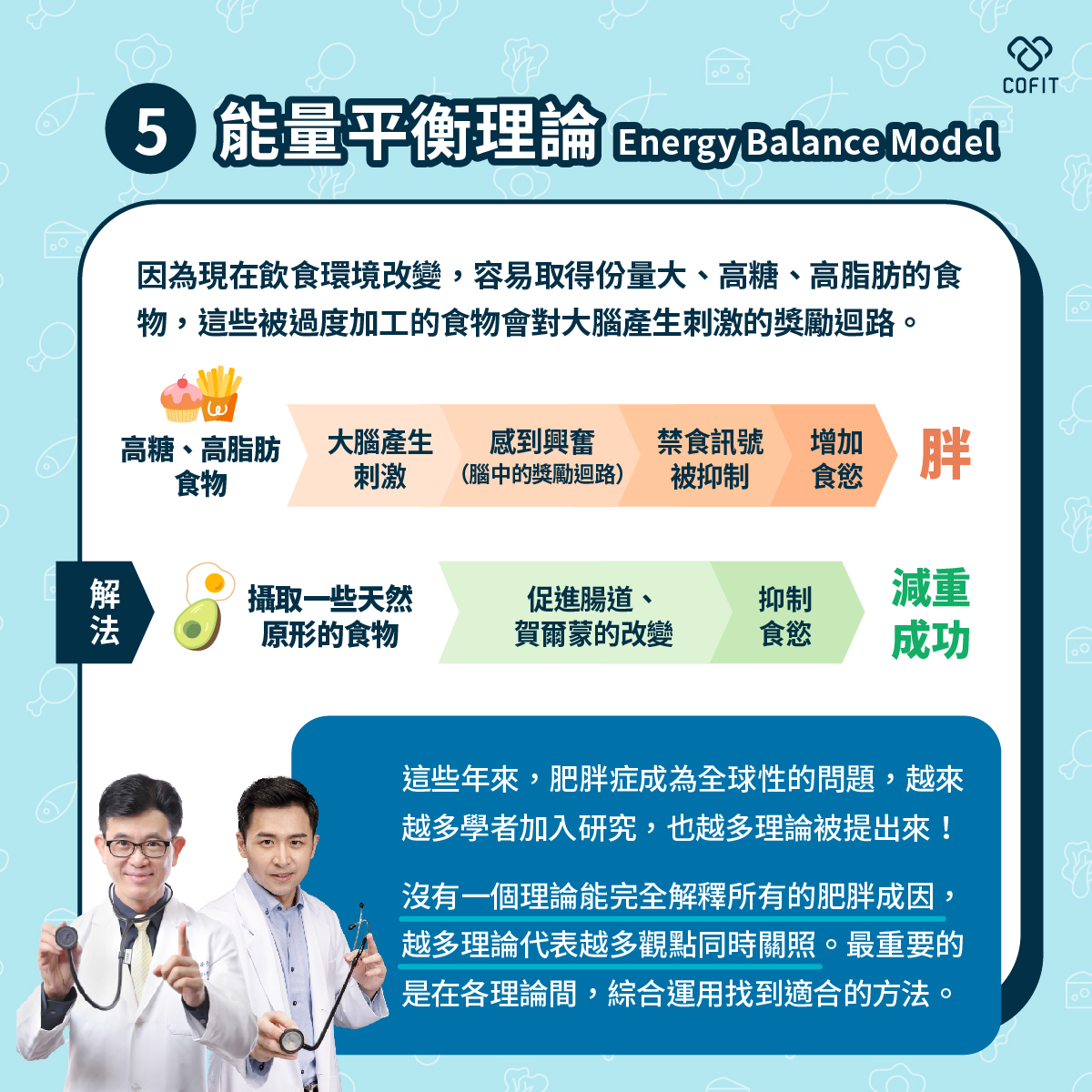 最後一個是近期許多人討論的理論,於2021年5月由兩位學者Roger Speakman和Kevin Hall發表論文中所提到的「能量平衡理論(Energy Balance Model)」。強調因為現在飲食環境改變,容易取得份量大、含高糖、高脂肪,卻相對低蛋白、低纖維的食物,這些被過度加工的食物會對大腦產生獎勵迴路的刺激。當攝取過多高糖高脂肪食物時,大腦會產生興奮的感覺,不知不覺使這類的食物攝取量增加,同時大腦禁食的訊號被抑制,進而造成肥胖的情形。
