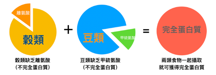 蛋白質是由小分子的二十種氨基酸排列組合而成的,其中有八種是人體不能自行合成(小孩子則有九種不能自行合成),這八種氨基酸稱之為必需氨基酸。單一植物性蛋白質所含的氨基酸常會缺了某一種氨基酸,所以稱之為不完全蛋白質。例如:豆類缺乏了甲硫胺酸,而穀類缺乏了離胺酸,但只要一起吃就可以補足成為完整的蛋白質(如下圖圖示)。
