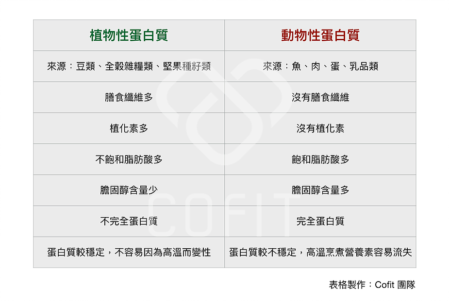 蛋白質食物的來源大致分為植物性跟動物性,兩者的差異如下: