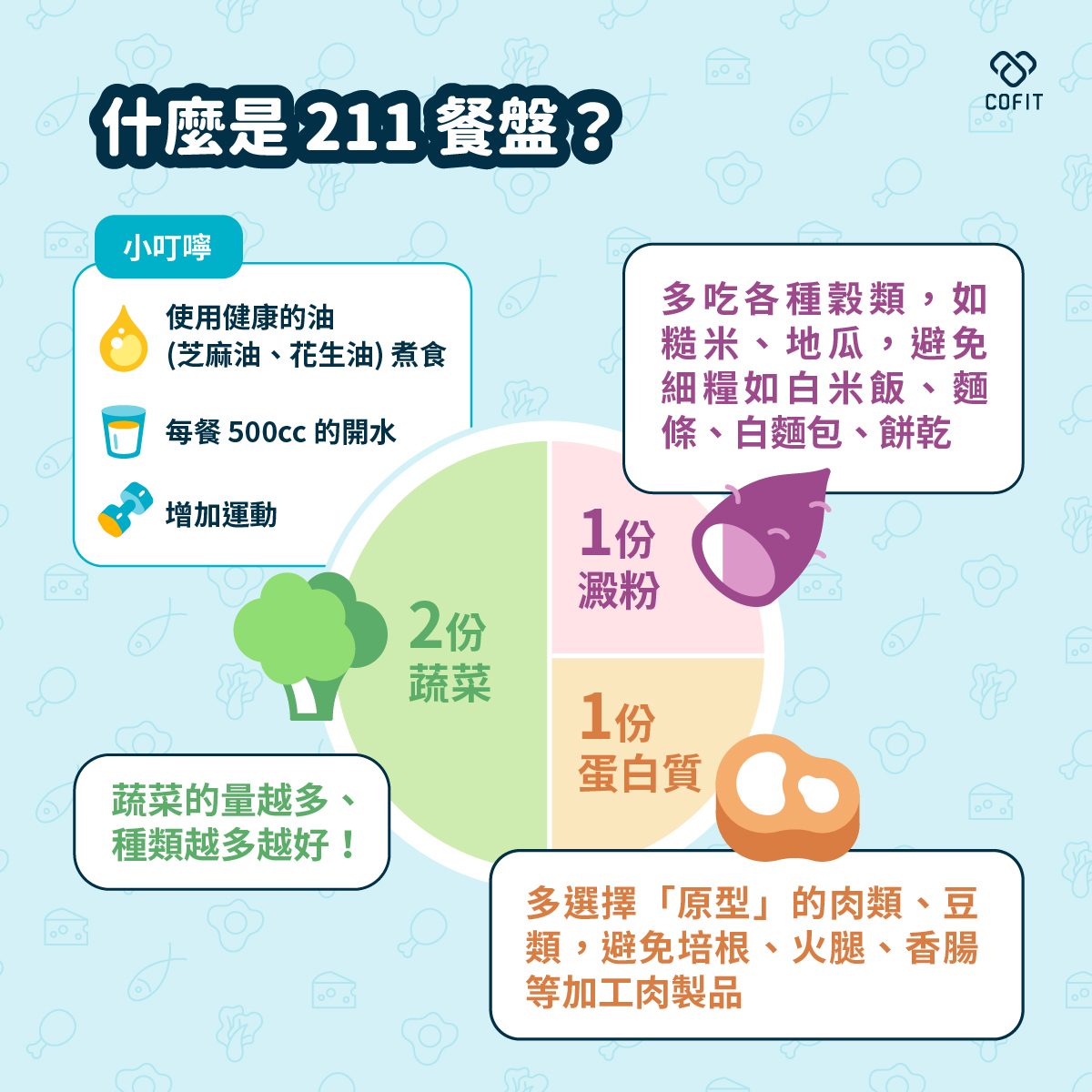 A:211的意思是指「比例」,而非具體的重量。重要的是保持蔬菜、蛋白質和澱粉的比例。如果發現吃得太多,可以按比例減少食物份量;而如果吃不飽,則可以增加每個部分的份量,但仍要保持蔬菜、蛋白質和澱粉的比例不變。重點是掌握好比例,以達到均衡的飲食效果。