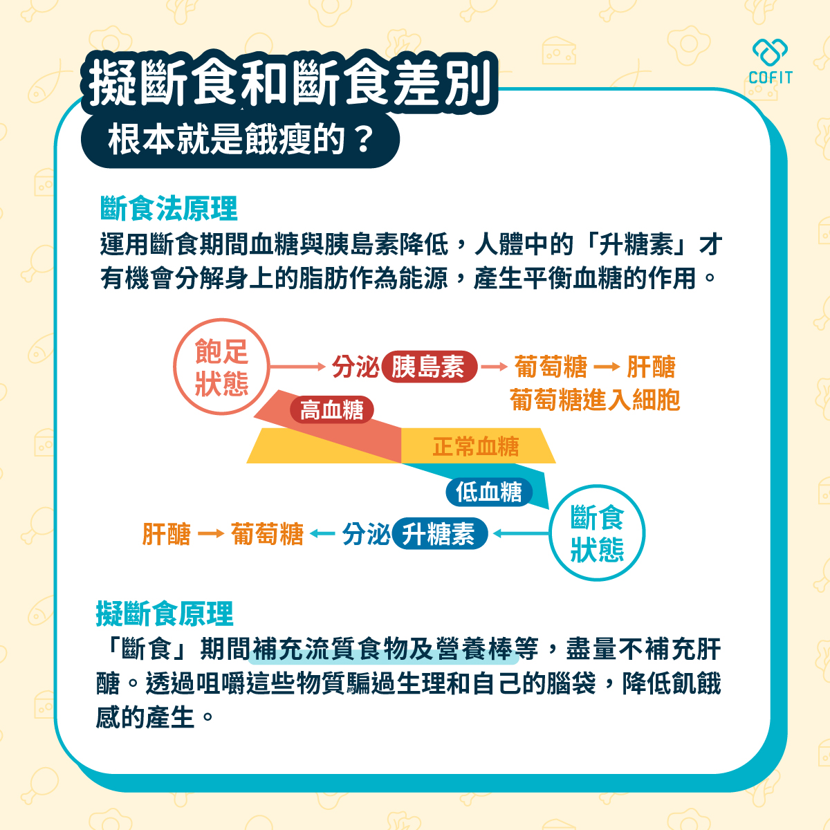 確實,在斷食過程中難免會感到飢餓,斷食的目的是利用沒有進食的時間,讓體內的「血糖」和「胰島素」水平下降,在這樣的狀態下,人體中的「升糖素」有機會分解身體的脂肪作為能源,以達到平衡血糖的效果。